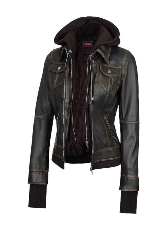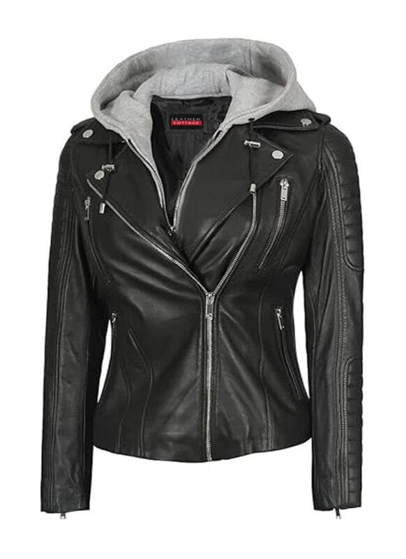 Black Hooded Leather Jacket for Women