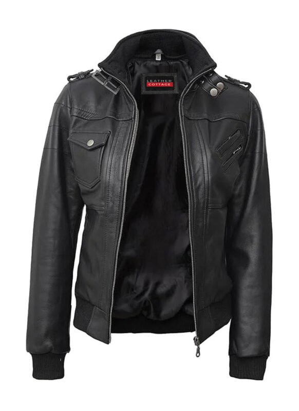 Women’s Black Hooded Bomber Leather Jacket