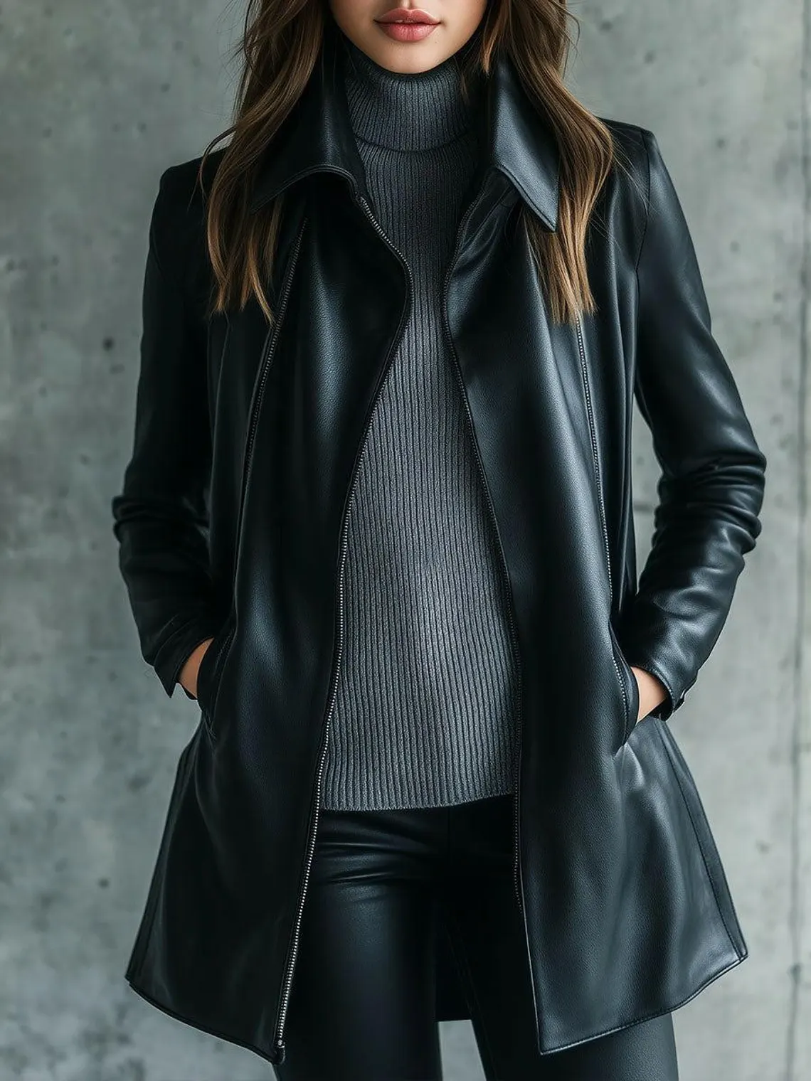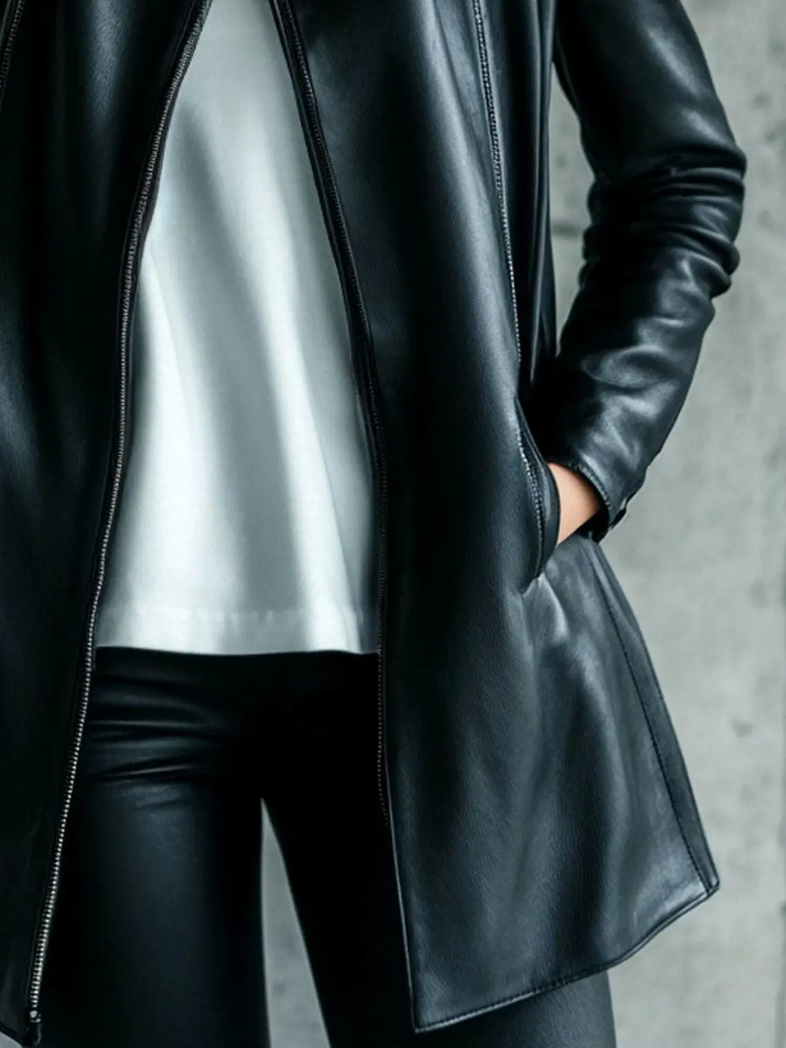 Practical yet polished, the coat includes two side pockets and an inner pocket, combining convenience with understated style. Whether paired with jeans and boots for a smart-casual look or layered over office attire for a professional touch, this leather coat transitions seamlessly across seasons and occasions.