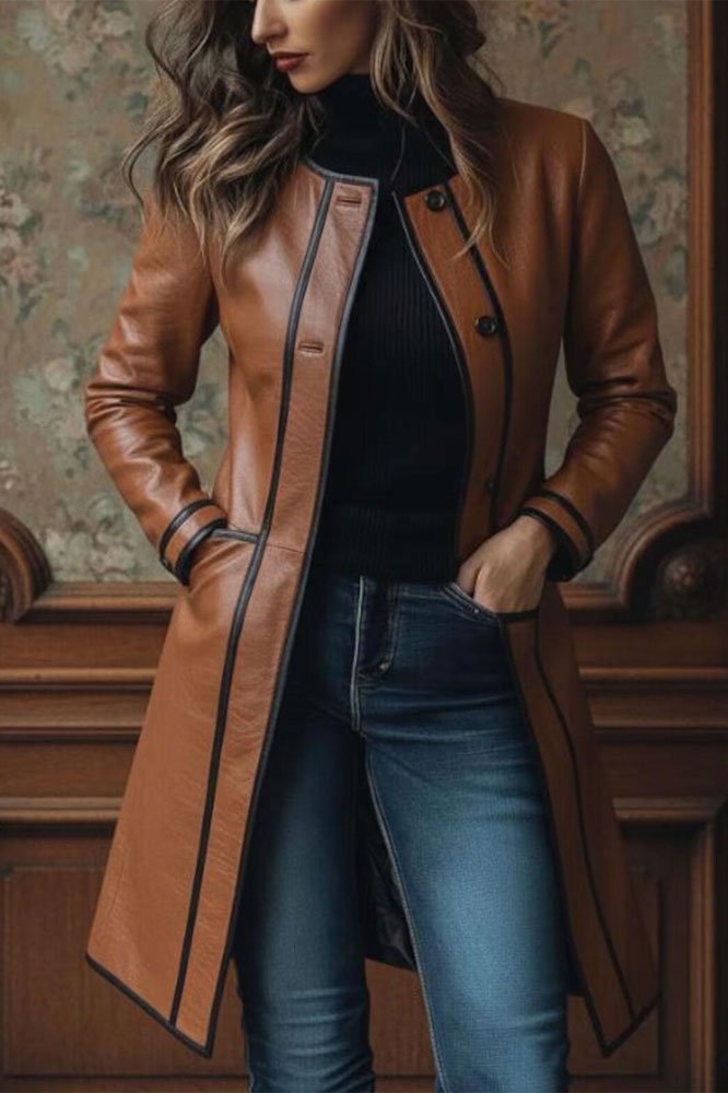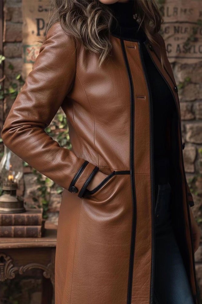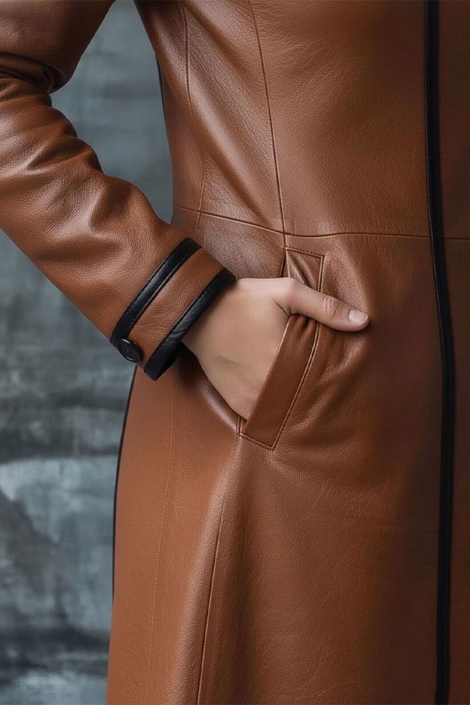 Designed for the modern woman, this long trench coat features a sleek, tailored silhouette that enhances your natural shape while providing effortless elegance. The smooth leather finish and refined stitching reflect expert craftsmanship, ensuring a polished look that stands out in any setting. Whether you’re heading to work, stepping out for a night on the town, or exploring the city, this coat adds instant sophistication to every outfit.