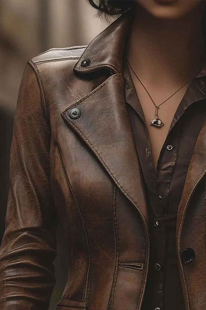 Designed with a vintage-inspired silhouette, this coat flatters your figure while offering a comfortable fit for everyday wear or special occasions. The rich brown leather features a naturally distressed finish, giving each coat a unique, worn-in charm that adds character and personality to your look. The soft inner lining ensures warmth and comfort, making it ideal for transitional seasons or cooler weather.